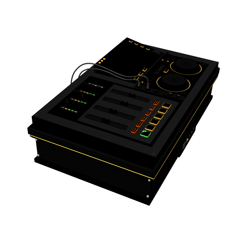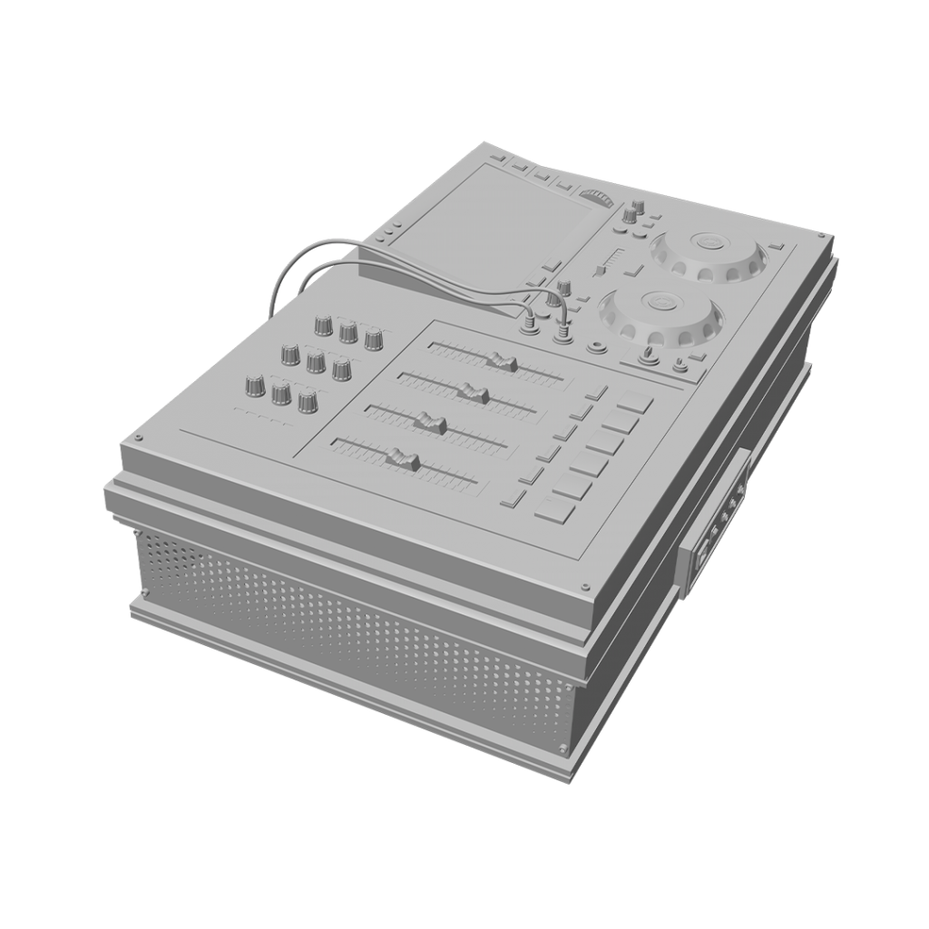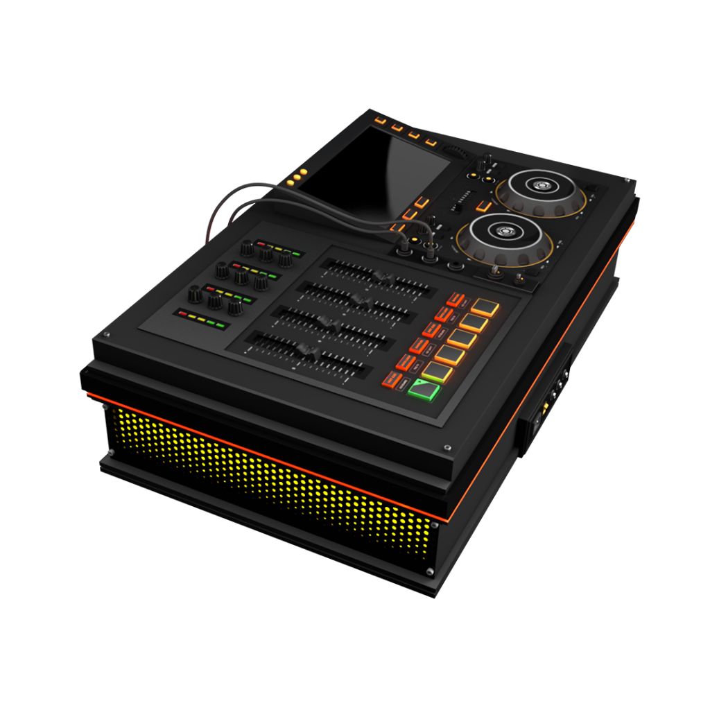 En vistas a que no terminaba de dar con una idea que me encajase de cara a este proyecto, recurrí a las mesas de mezcla de Pionner. Utilizándolas como referencia, ideé mi propio dispositivo con un soporte luminoso en su parte inferior, haciendo alusión a esa idea primaria que tenía en mente.
