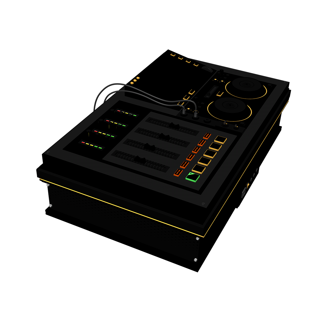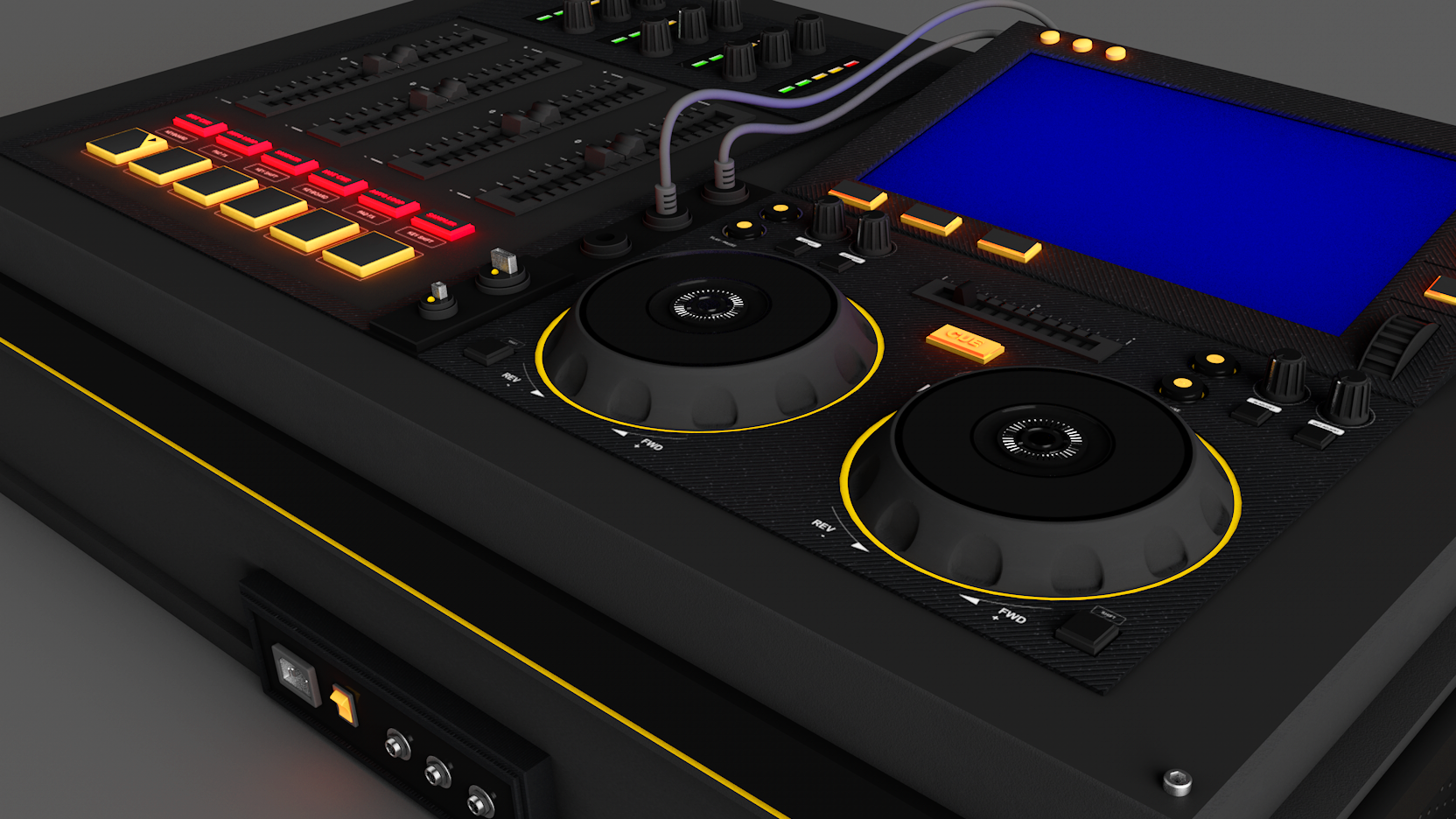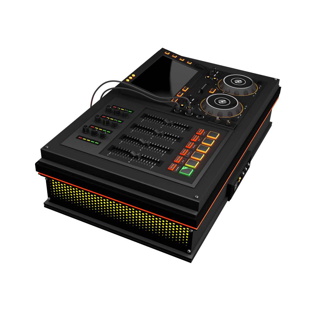 En vistas a que no terminaba de dar con una idea que me encajase de cara a este proyecto, recurrí a las mesas de mezcla de Pionner. Utilizándolas como referencia, ideé mi propio dispositivo con un soporte luminoso en su parte inferior, haciendo alusión a esa idea primaria que tenía en mente.